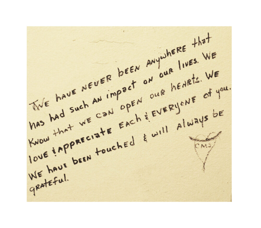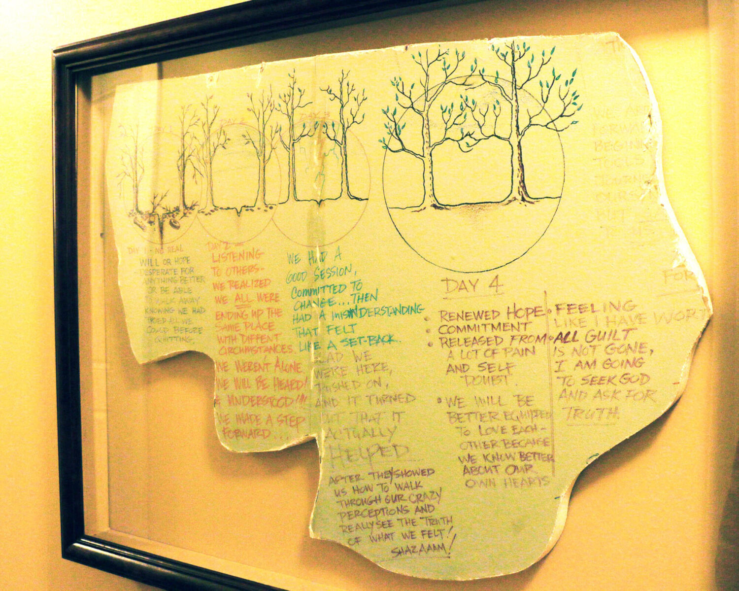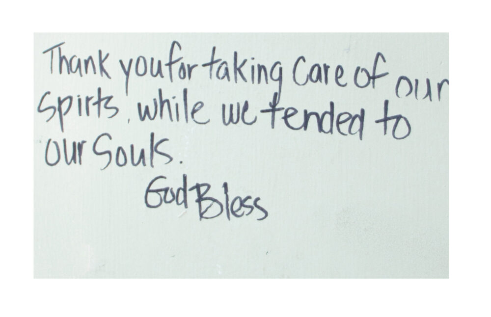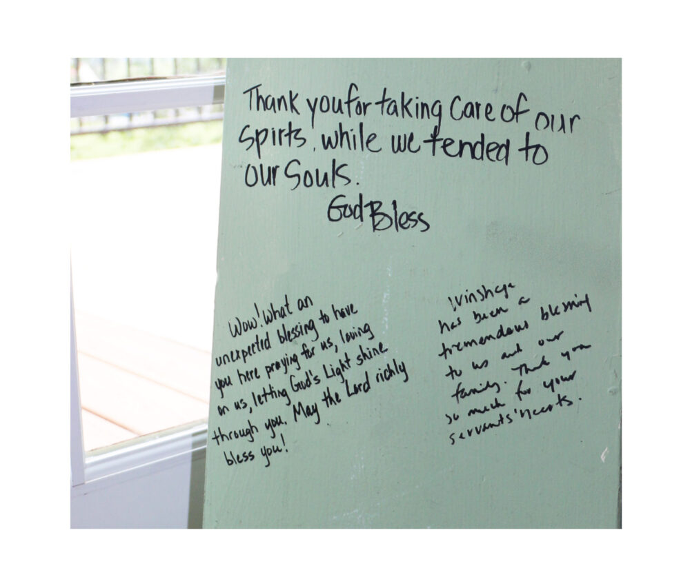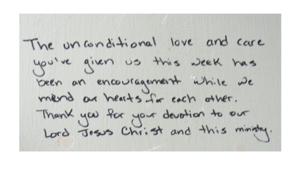 When WinShape Marriage hosted its first Intensive, couples were encouraged to write about their experiences on the walls in the closets of The Normandy Inn. Those closets hold stories of transformation, hope and prayer. When it was time to renovate the building, the plaster was preserved and some of the transcriptions were framed and hung in the hallways, where a leisurely stroll includes captivating translations of marriages that came here broken and left on the path toward healing. Guests are still encouraged to share their perspectives by writing on the walls today.